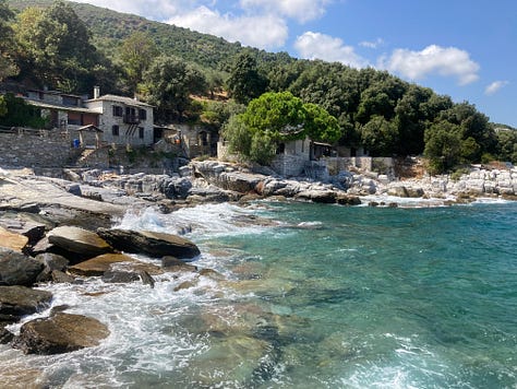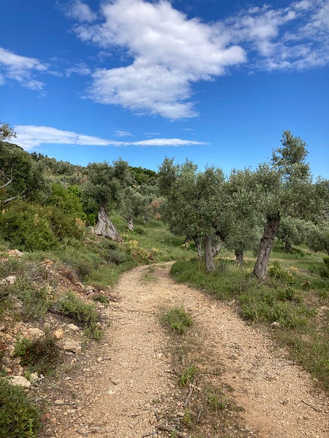 Those same routes, which range from wide, gravel ones, to undulating two-tracks, to the cobbled kalderimis are also perfect for trail running and hiking. The concept of land-ownership is quite different here than in the U.S. A good deal of the peninsula is covered with olive groves, which are private, but almost never fenced off, and which are usually comprised of dozens of smaller parcels owned by different people. Public roads and trails pass through the groves so all the property owners can get to their plot. The result is that it all feels like public land and no one’s going to shoot you for running through their olive grove.