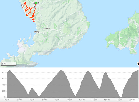 The peninsula’s biggest paved climb, and one that I have yet to attempt, starts in the town of Agria, about 20 feet above sea level, and ascends 3,885 feet over 10.8 miles. The average gradient is a leg-wrenching 6.8%, but the upper part has segments as steep as 18%. And if you want, you can push the vertical up to 4,000 feet by continuing to the ski area. Yes, there is a ski area within a 12 mile drive from the beach, one that can get quite a bit of snow. And, by the way, a lot of folks swim here year-round. So you could ride your bike to the ski area, take a few runs, ride back down to the beach, take a swim, and finish the day off with tsipouro and meze at a taverna in Agria. Seriously.