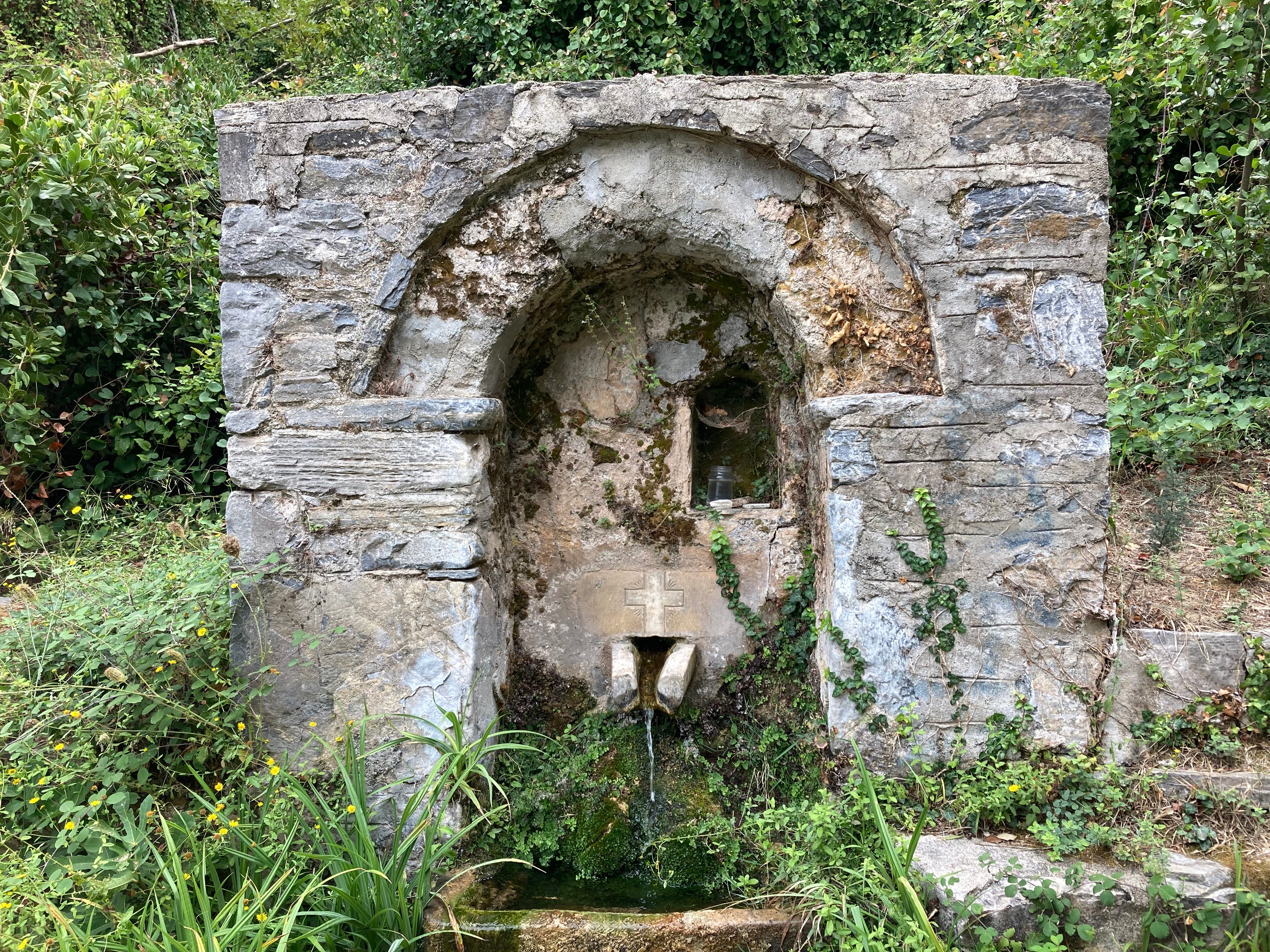 Around a third of the way up there’s a small church called Panagia Mesosporitissa. Panagia translates to the all-holy one, or the Virgin Mary, and Mesosporitissa is a ritual that takes place halfway thru fall planting. In pre-Christian times, the planting ritual was connected to Demeter—goddess of the renewal of nature and the germination of the grains. Once Christianity arrived, the Virgin Mary replaced the goddess Demeter as the chosen entity. There is also a small spring next to Panagia Mesosporitissa where we always stop to let Lada have a drink and to fill our water bottles.