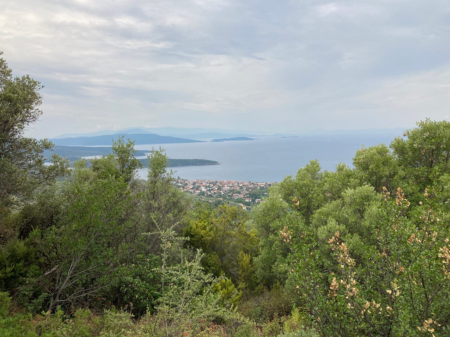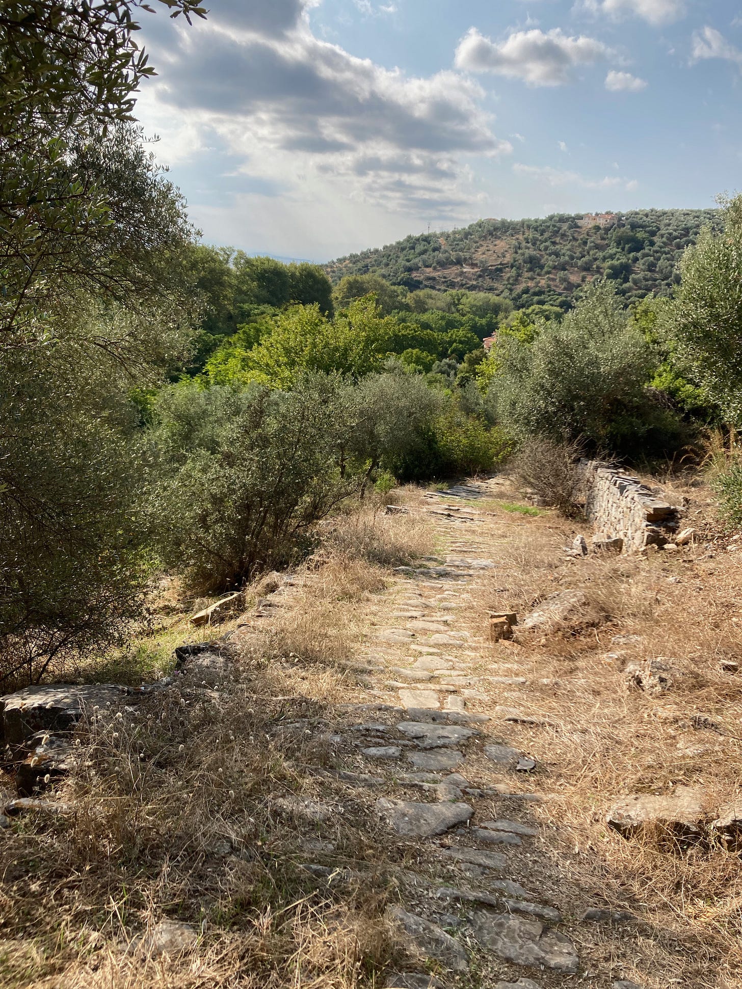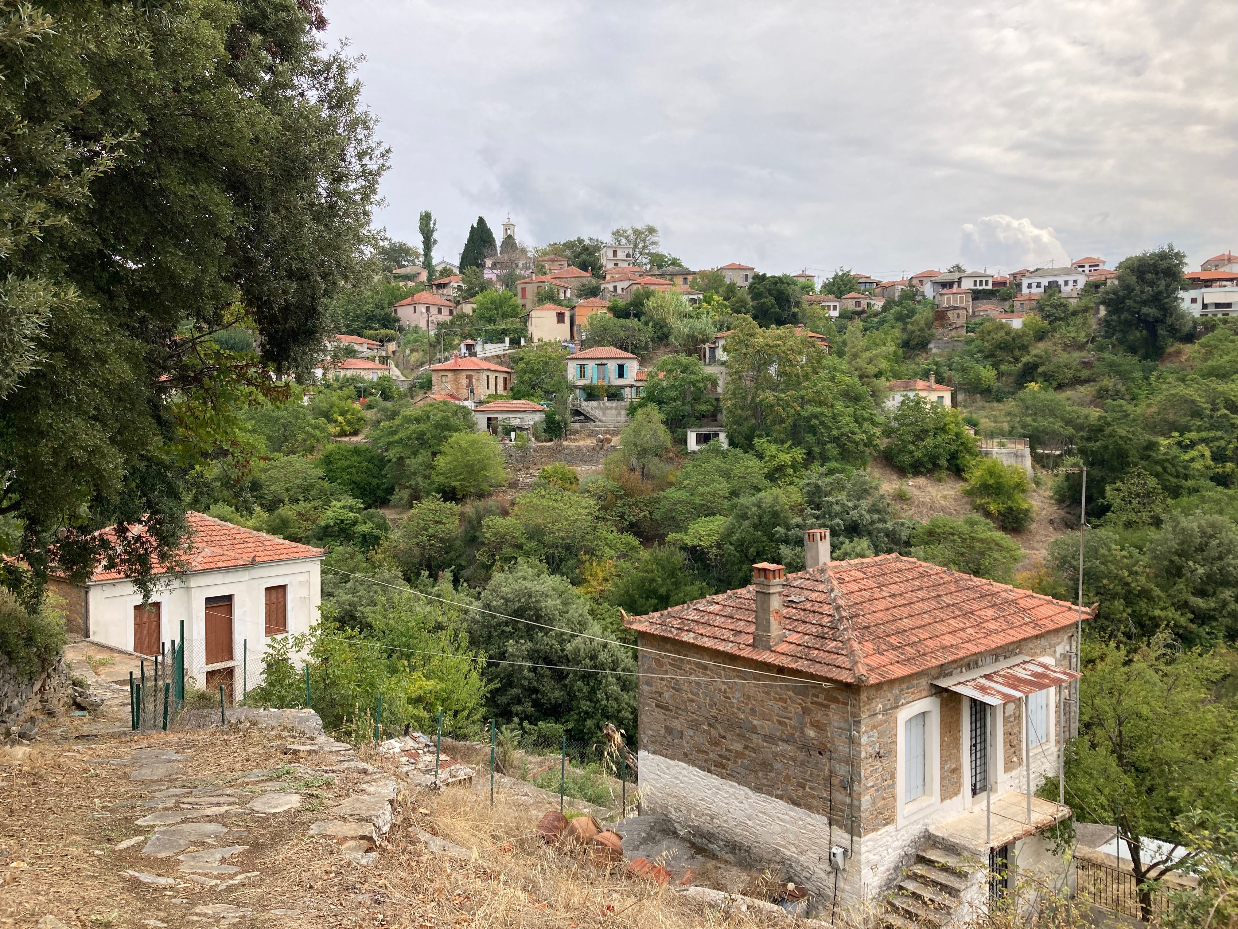 Here in the Pelio Peninsula, I have found myself over these past few months returning to a trail, known as a Kalderimi, that starts in Milina—a small village next to the sea around 4 miles from our house—and ends in Lafkos, a picturesque village perched at 1,000 feet in elevation on top of the ridge. The trail bed is mostly cobblestone built over a hundred years ago with pezoules (low stone walls) on both sides. At first the trail winds through thick vegetation but then opens up to magnificent views of the Pagasitikos Gulf.