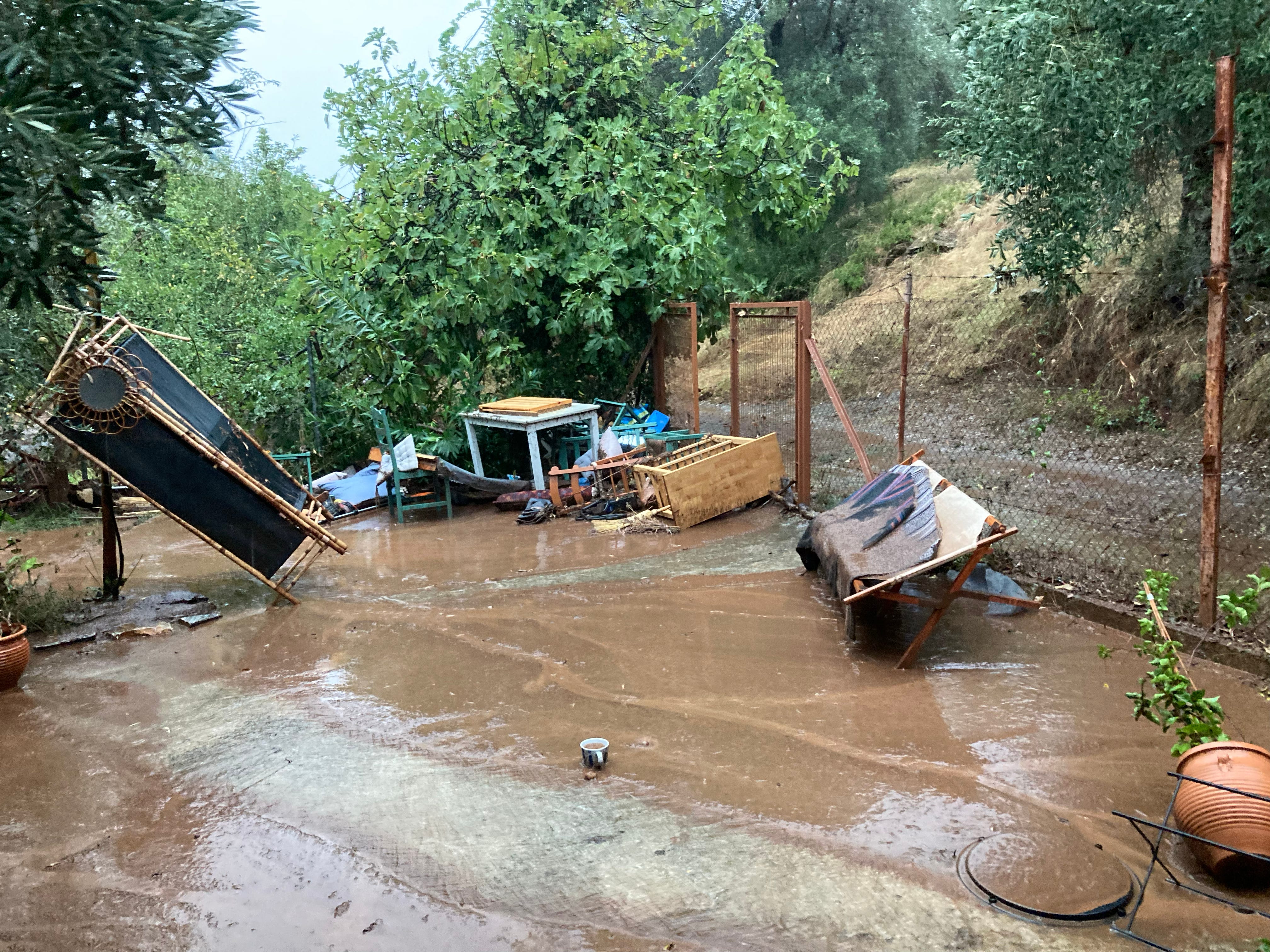 We’re safe and dry in a friend’s house. The power keeps flickering on and off and the water line to the village must have gotten clogged or broke, so we have no running water. The road to the nearest grocery store and other amenities is impassible. And that town, Milina, is reportedly flooded as well.